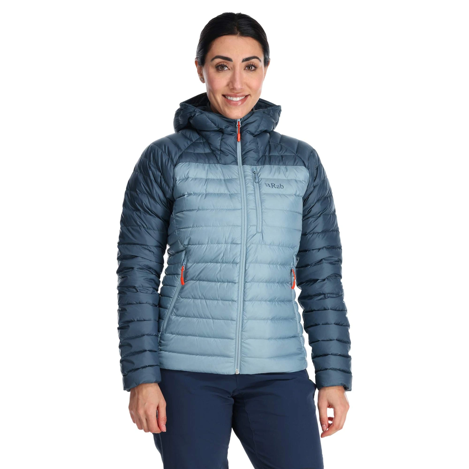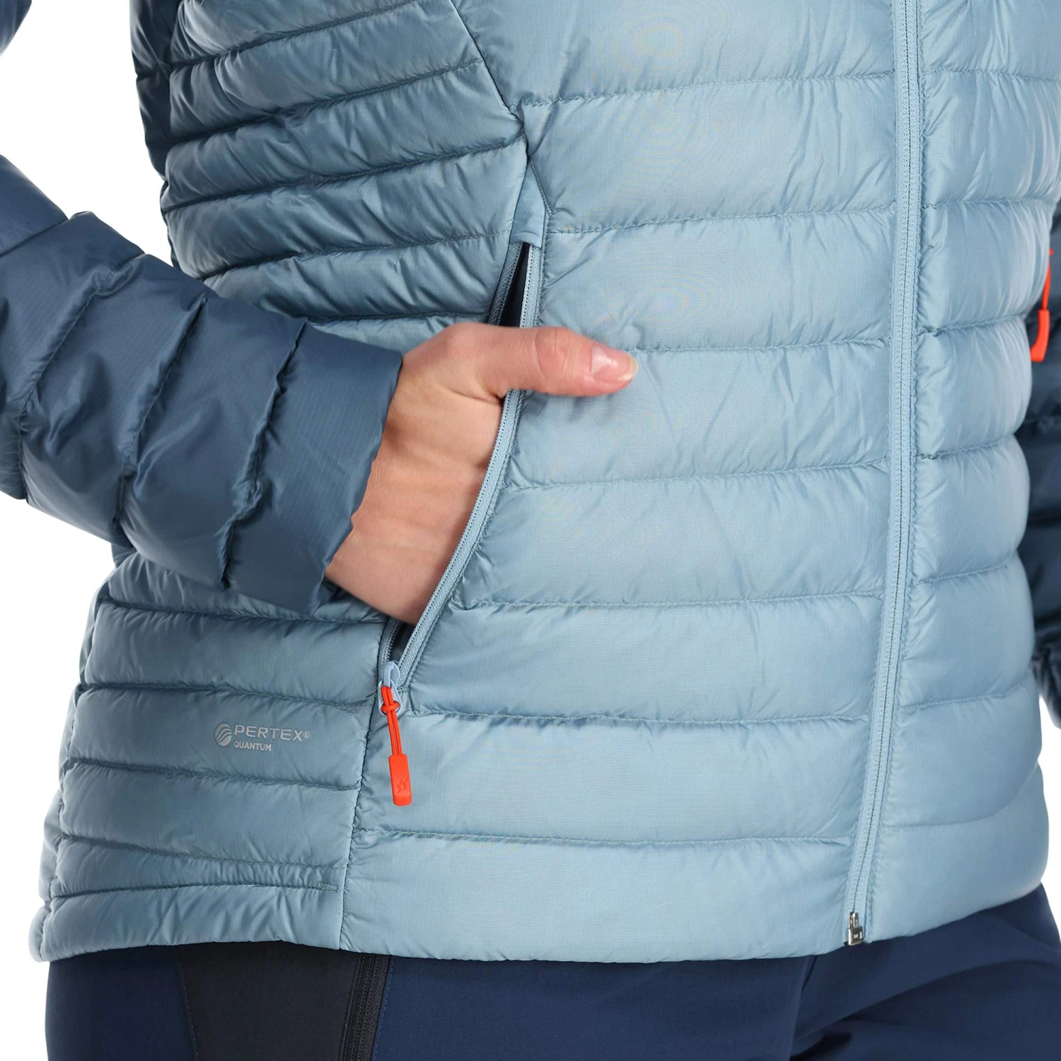 Das Außenmaterial besteht aus einem besonders leichten, strapazierfähigen Nylon-Gewebe (Pertex Quantum). Das Material sieht kleineren Regen- oder Schneeschauern ganz gelassen entgegen, denn es ist wasserabweisend imprägniert. Ebenso wie das Innenmaterial hat auch das Außenmaterial einen angenehm weichen Griff. Für eine gute Portion Wärme an kühlen Tagen sorgt die mitteldicke Daunenfüllung. Die Daunen sind wasserabweisend imprägniert. Dadurch halten sie länger warm, wenn sie durch Schweiß oder starke Niederschläge einmal feucht geworden sind.